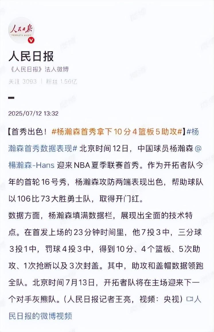 杨瀚森的NBA首秀确实惊艳,他在攻防两端都给对手带来了巨大的压力,甚至还把勇士3名球员打急眼了。而看到杨瀚森表现如此出色,新华社、人民日报和央视新闻三大官方媒体纷纷转发,这足以体现牌面之足。对于自己的表现,杨瀚森并没有骄傲,在赛后接受记者采访时,他就表示:在NBA挑战升级,要提高自己,为国家队打好比赛,为国争光。说实话,小伙子情商真高,这样说话怎么能让球迷不喜欢了。